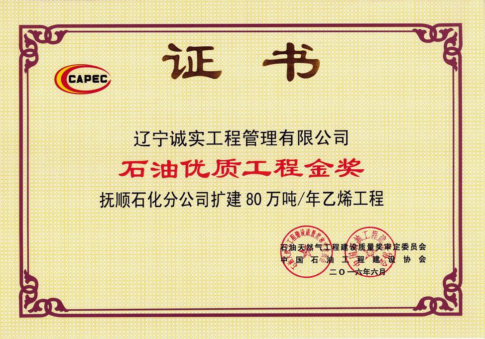2016年石油優質工程金獎(撫順石化...
